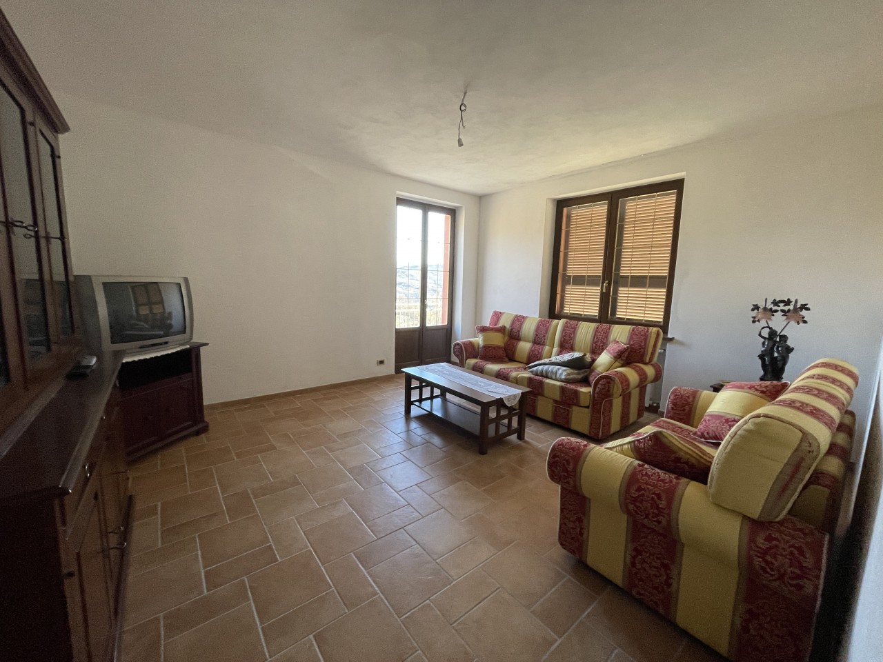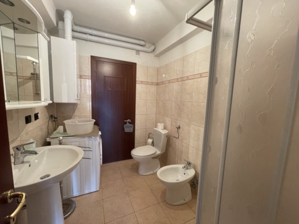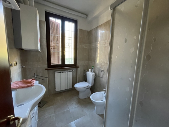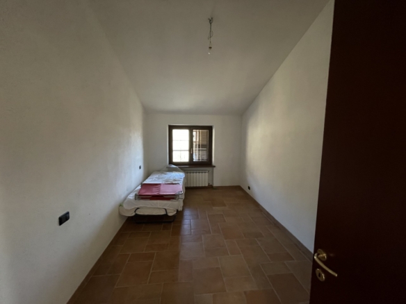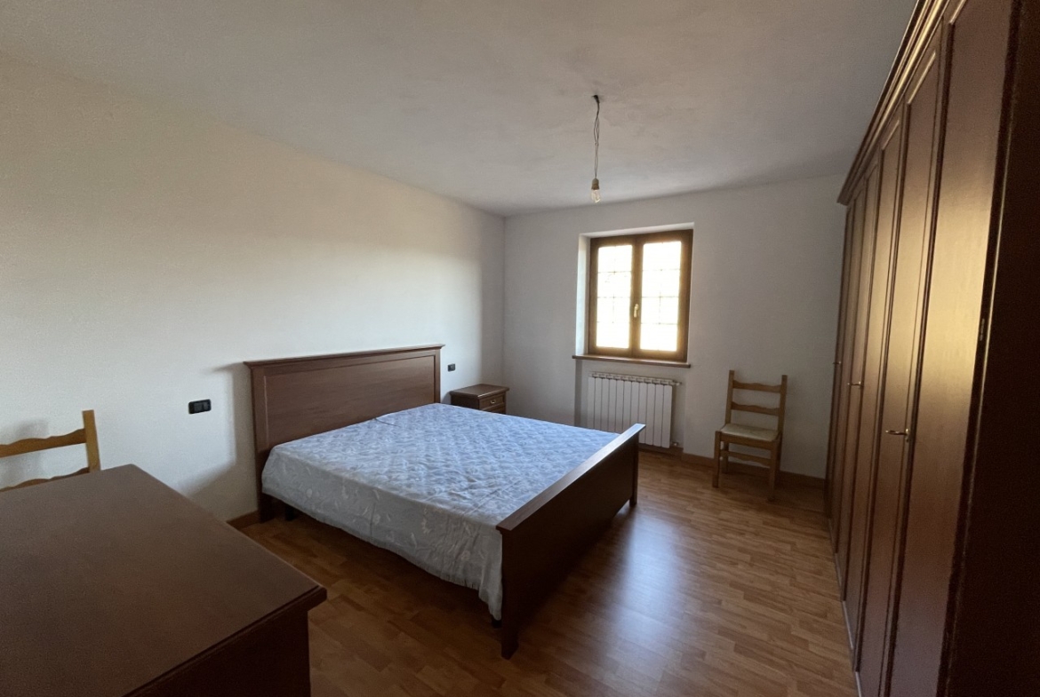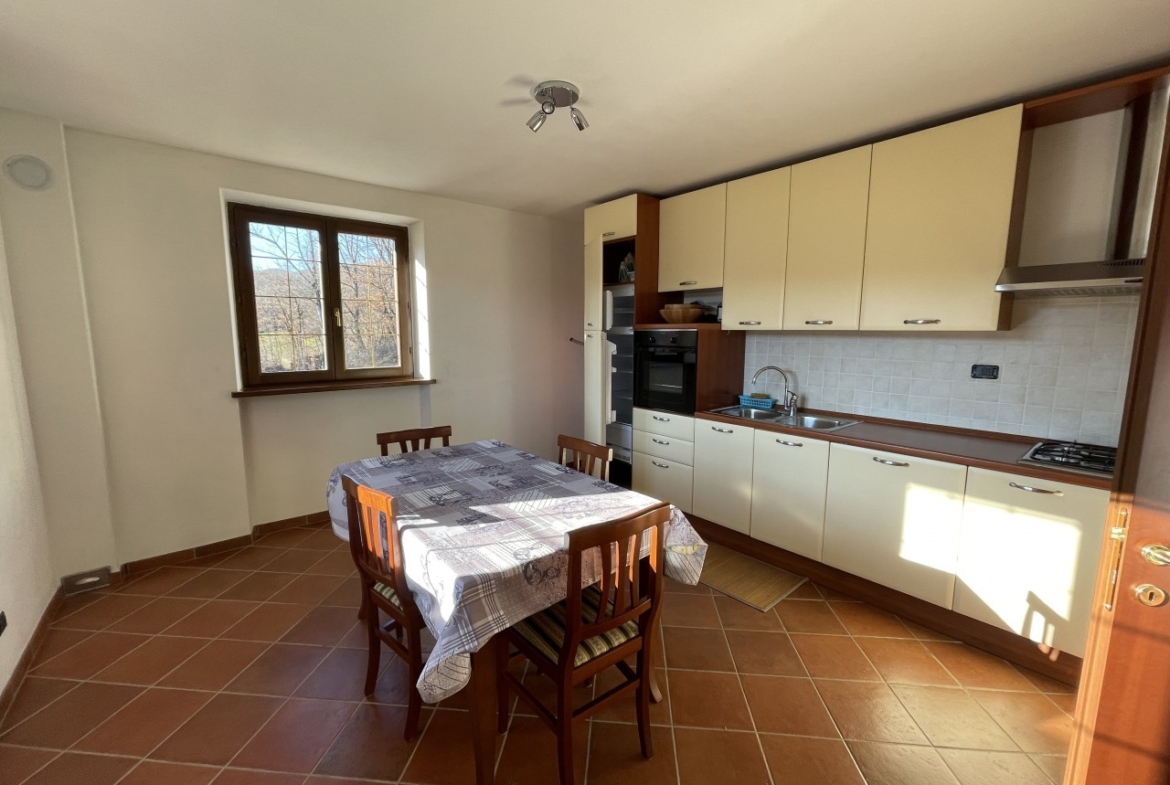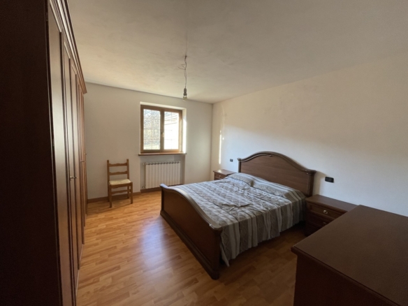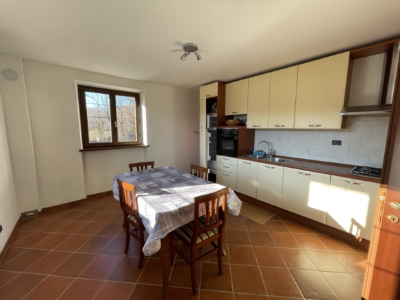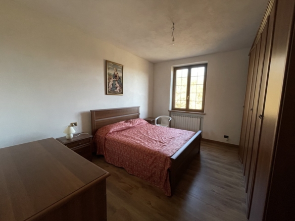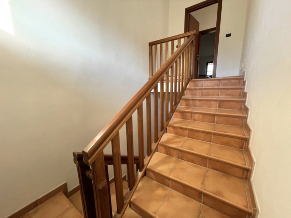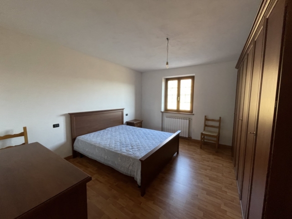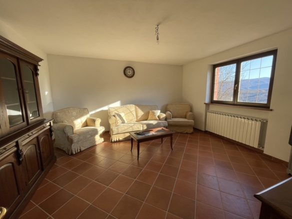 L’appartamento al piano terra ha l’ingresso nella parte dell’immobile prospiciente la vallata e da qui direttamente nel corridoio che conduce ai locali, dapprima della zona giorno, addentrandosi della zona notte. Partendo dal lato destro dell’entrata troviamo in successione: il salotto, una camera singola ed una matrimoniale; sul fondo del corridoio il primo locale bagno per poi proseguire con un’ulteriore camera matrimoniale, un secondo bagno e l’ampia cucina abitabile con doppia esposizione.