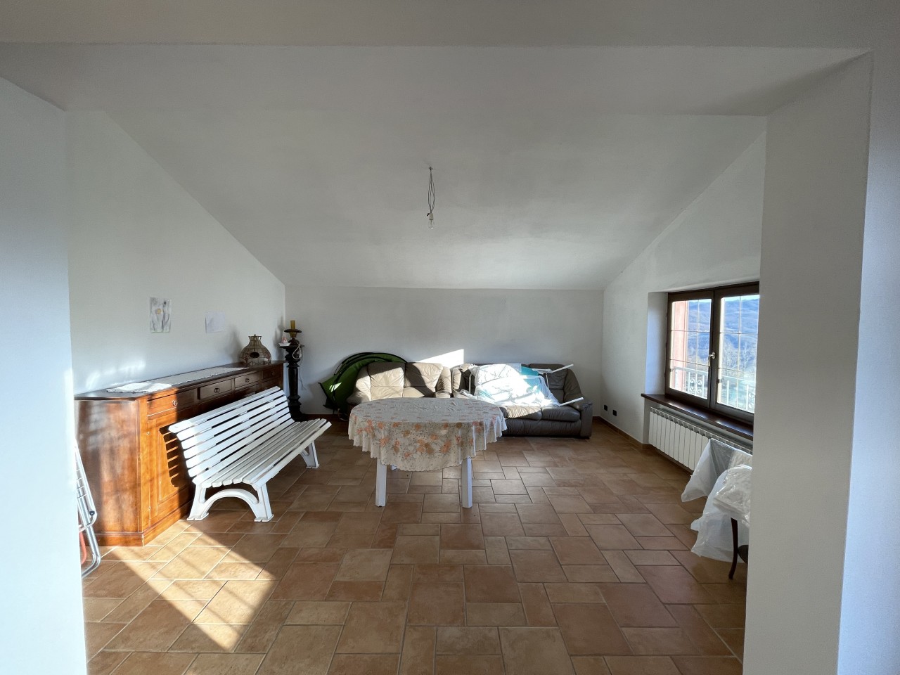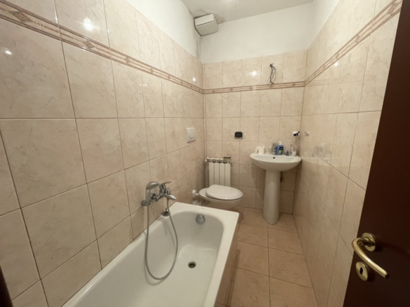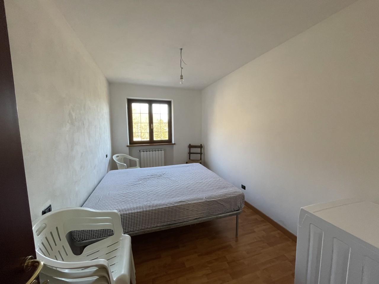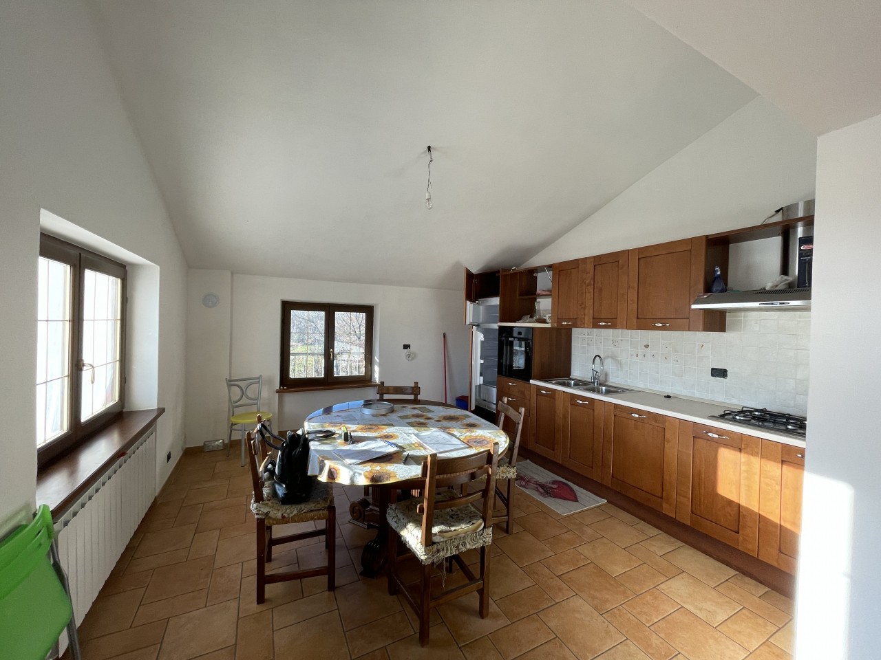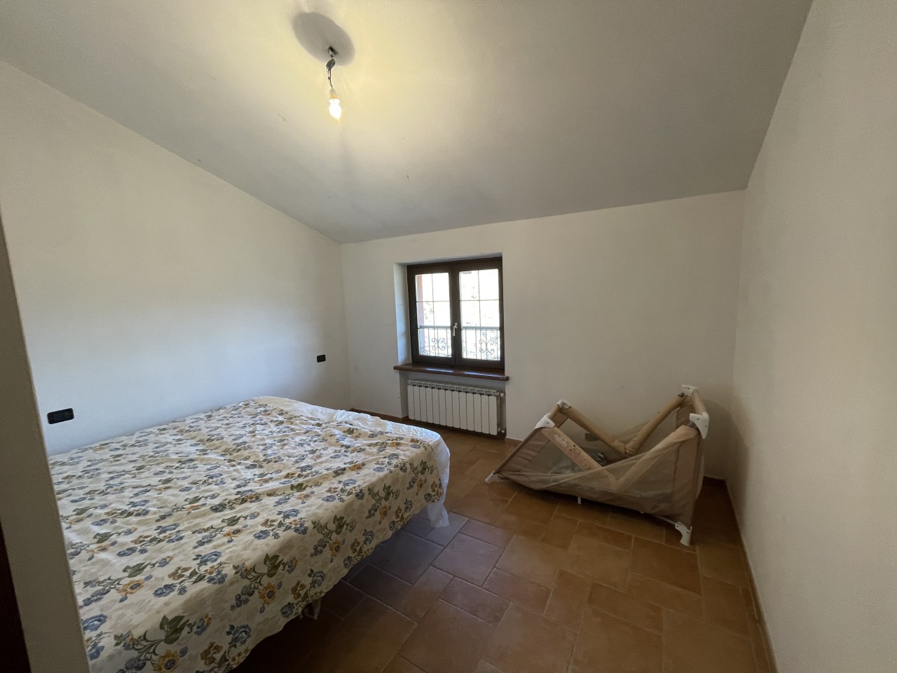 L’appartamento al piano terra ha l’ingresso nella parte dell’immobile prospiciente la vallata e da qui direttamente nel corridoio che conduce ai locali, dapprima della zona giorno, addentrandosi della zona notte. Partendo dal lato destro dell’entrata troviamo in successione: il salotto, una camera singola ed una matrimoniale; sul fondo del corridoio il primo locale bagno per poi proseguire con un’ulteriore camera matrimoniale, un secondo bagno e l’ampia cucina abitabile con doppia esposizione.
