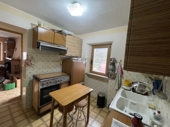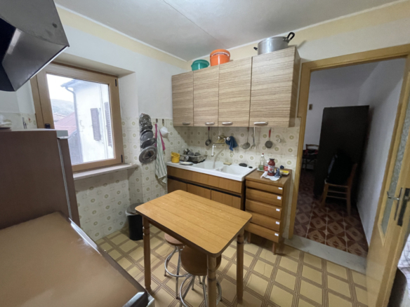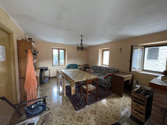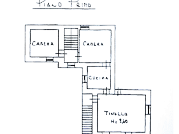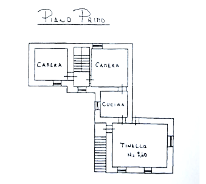 Il piano primo, raggiungibile anche per mezzo di una scala esterna in sasso, è dedicato interamente all’abitazione dove si dispiegano in sequenza: il tinello; il locale cucina e due camere da letto indipendenti.