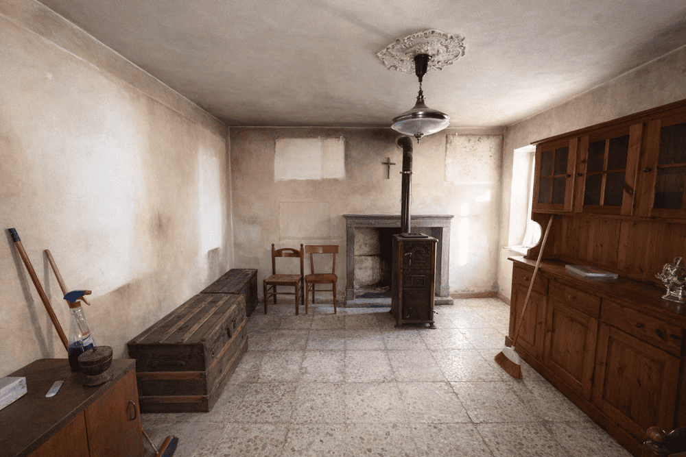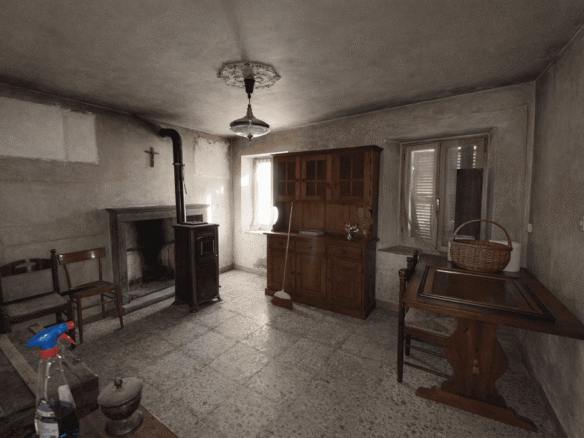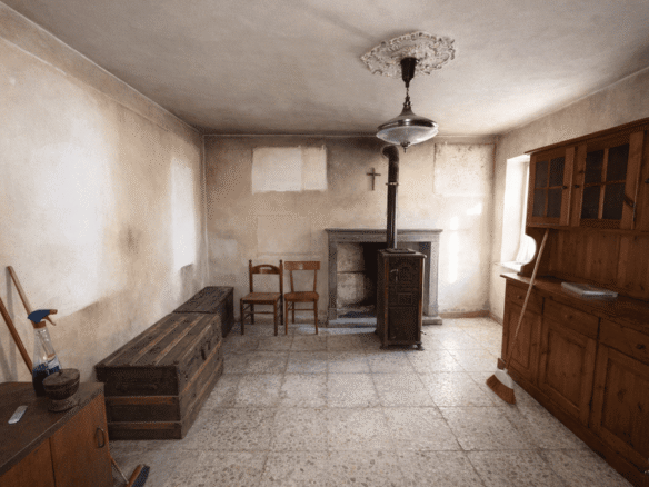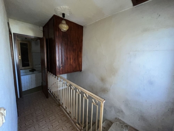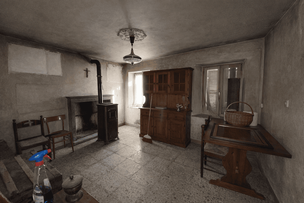 L’immobile dispone di due accessi affiancati al piano terra, entrambi affacciati su una delle strette vie del borgo: il primo conduce al disimpegno della zona giorno, collocato alla base della scala interna che funge da collegamento per il piano superiore; il secondo introduce invece direttamente nella luminosa sala, resa particolarmente suggestiva dalla presenza di un maestoso camino realizzato in sasso.