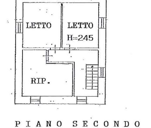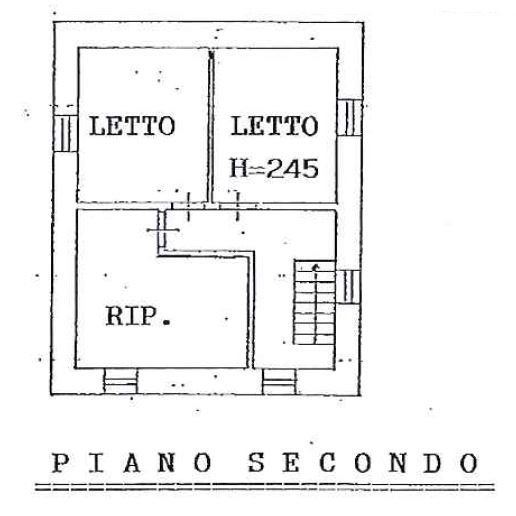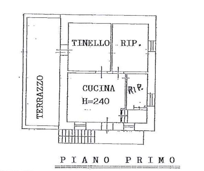 L’accesso all’abitazione avviene tramite una scala esterna che conduce direttamente alla sala da pranzo situata al primo piano. Da qui si raggiungono altre due stanze, una delle quali con uscita sulla terrazza, oltre al sottoscala e al vano scala che collega il primo piano con quello superiore.