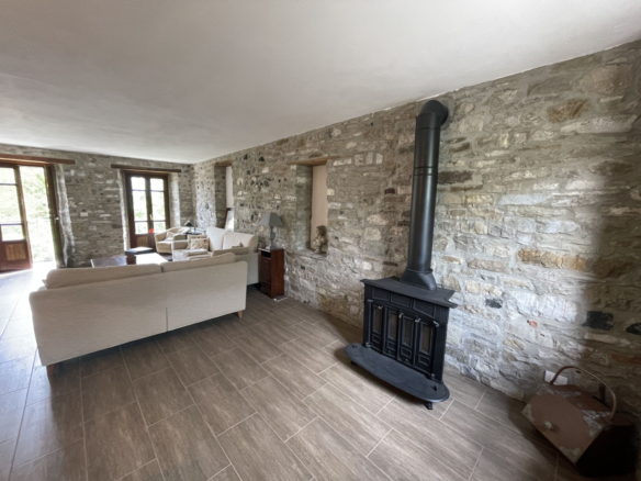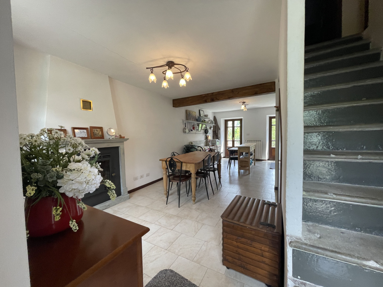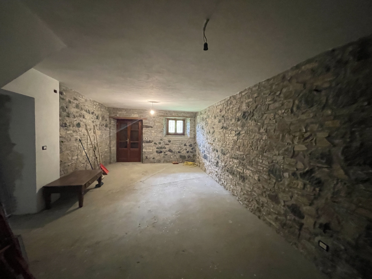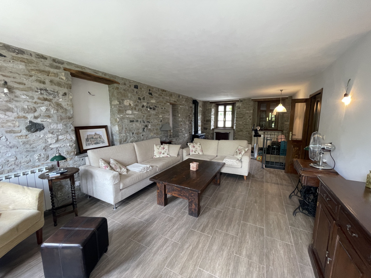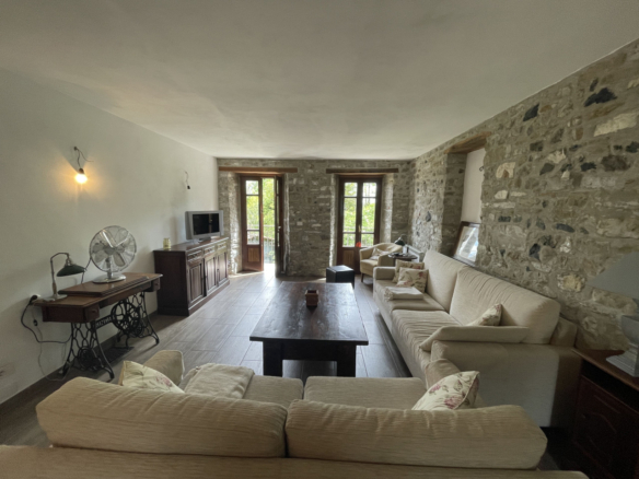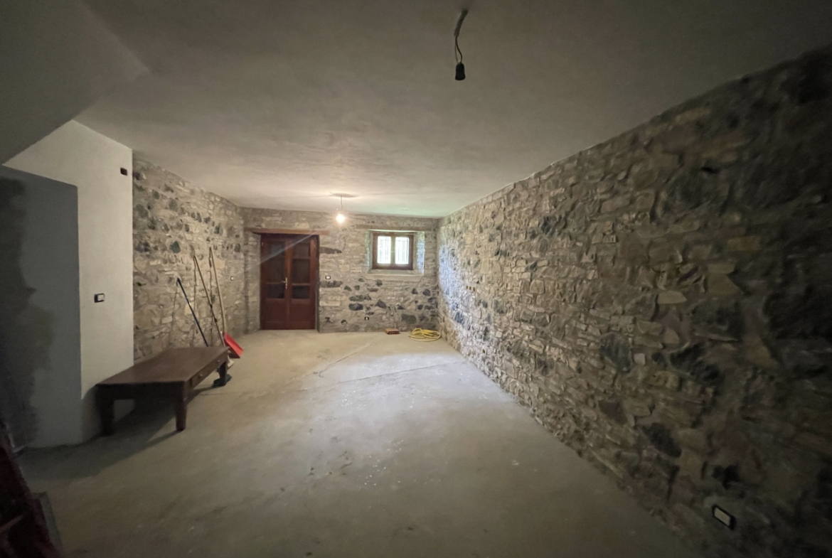 Il piano terra, interamente dedicato alla zona giorno è composto da una sala da pranzo, con camino in sasso, una ampia cucina ed un imponente salone, da cui parte la rampa in sasso che conduce al piano seminterrato. Arricchisce il primo piano la lunga balconata panoramica, prospiciente la maestosa vallata, sul fronte dell’immobile.