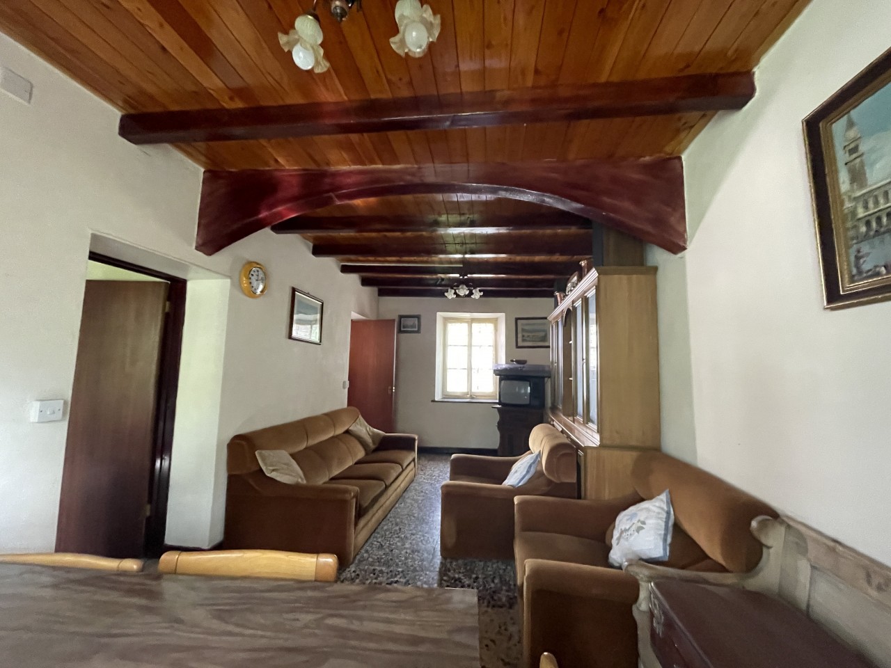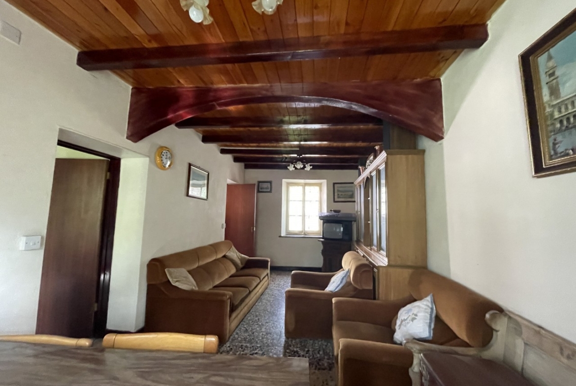 Sempre partendo dal disimpegno, di ingresso si può proseguire nel salotto con doppio affaccio e da qui all’ampia cucina arricchita da un antico caminetto in pietra.