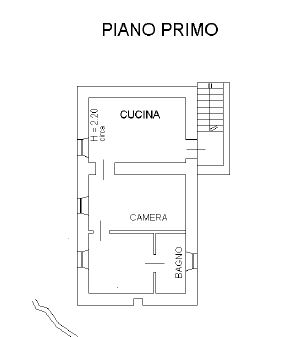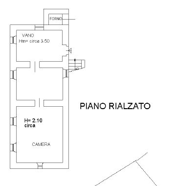 Il piano rialzato, ampio 45mq è raggiungibile unicamente per mezzo di una scala in sasso esterna ed è interamente adibito ad abitazione comprendendo: un locale cucina; un locale sala (o camera matrimoniale), una seconda camera matrimoniale ed un locale bagno finestrato con doccia.