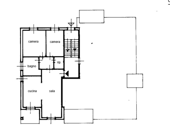 L’accesso all’appartamento immette direttamente nella sala, ambiente centrale e accogliente, comunicante sia con la cucina sia con un disimpegno che introduce alla zona notte; su questo si affacciano due camere da letto matrimoniali ed un ampio bagno finestrato dotato di doccia.