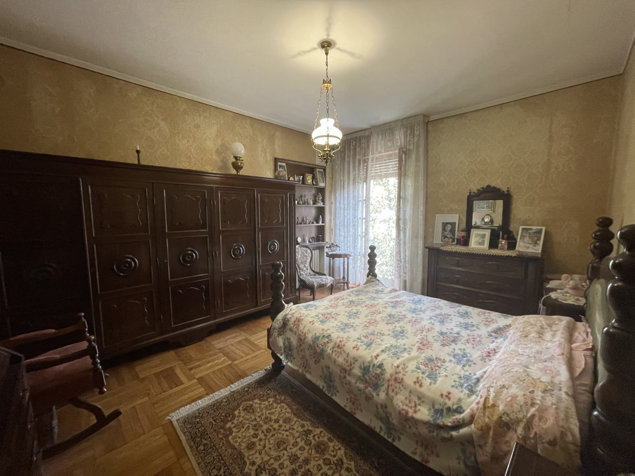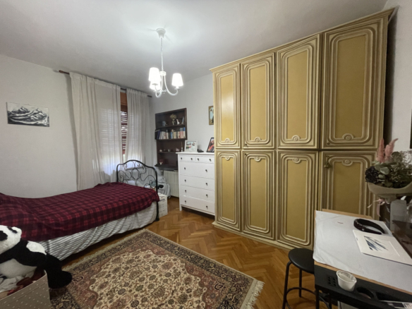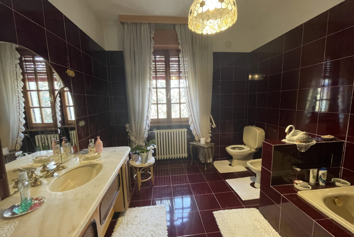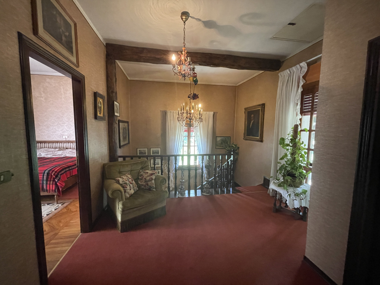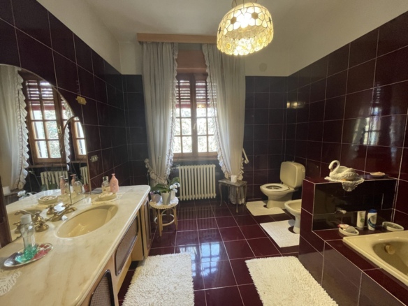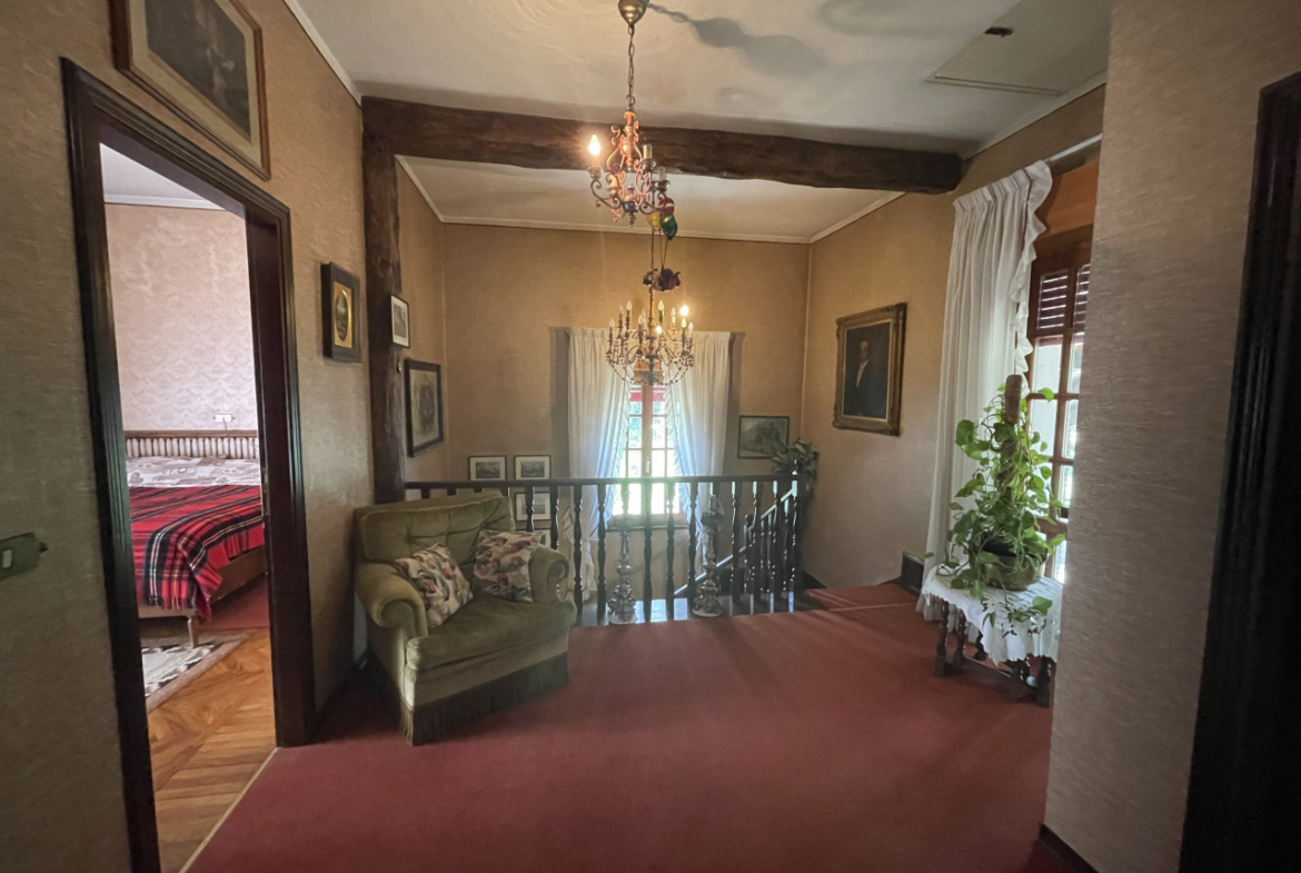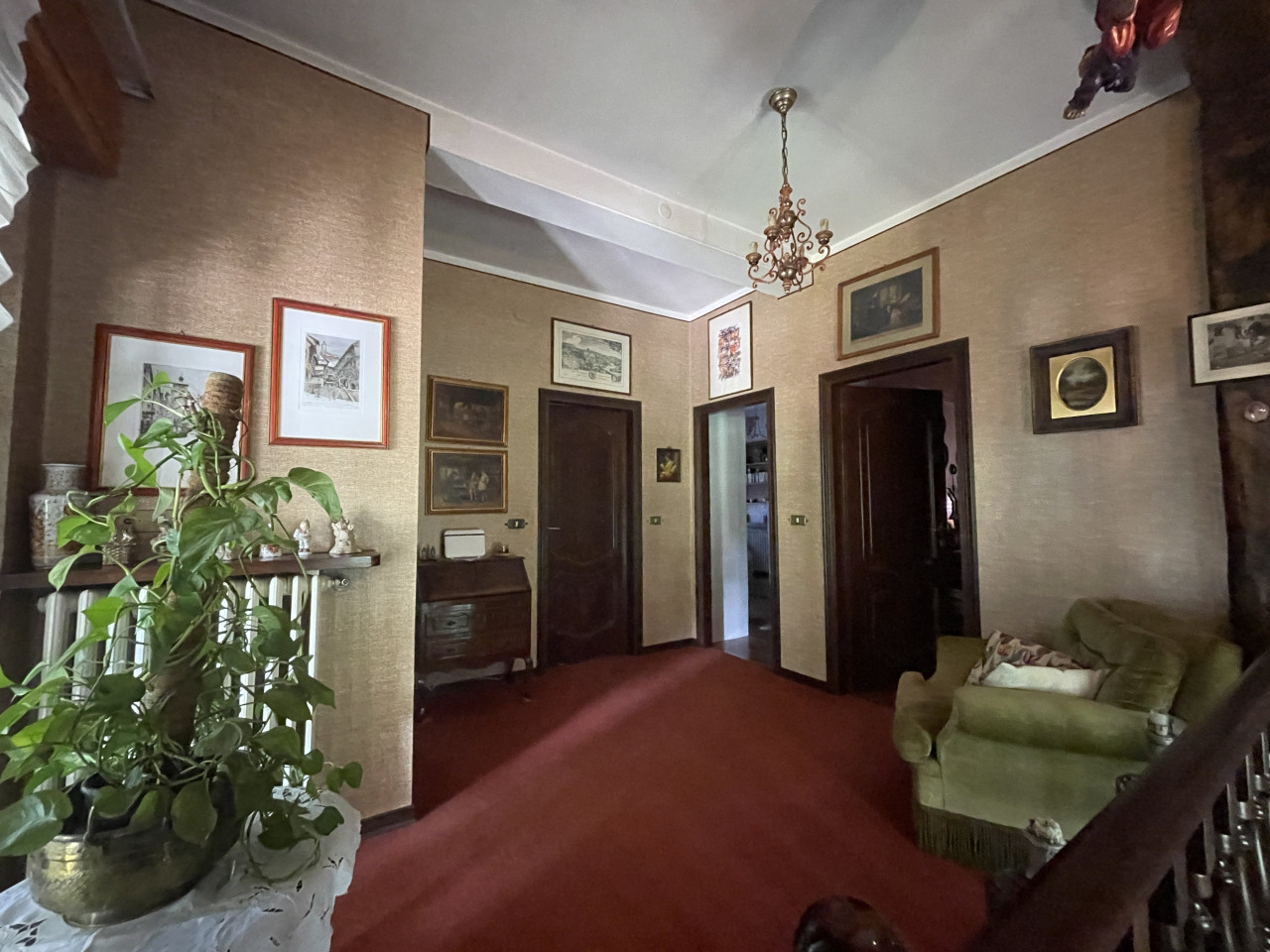 Percorrendo la maestosa scala in legno si accede al piano primo dove si trova un ampio disimpegno e la possibilità di accedere a tre camere matrimoniali nonché ad un elegantissimo bagno finestrato con vasca.