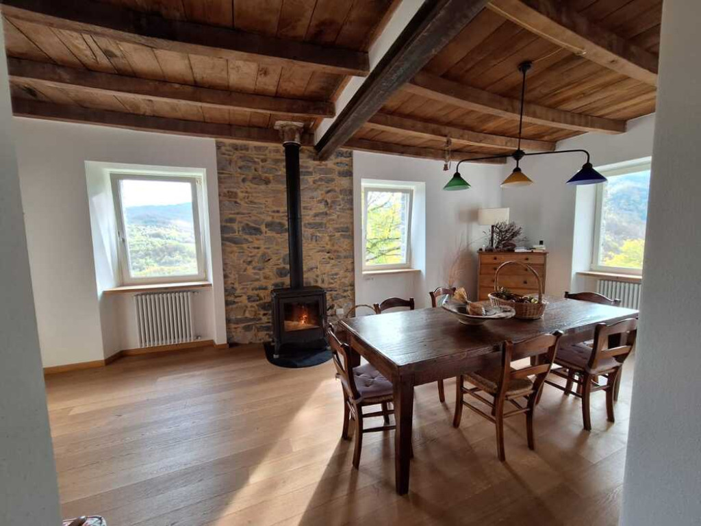 The meticulous renovation carried out by the current owners has preserved the home's original features, highlighting the natural stone floors, wooden beams, and exposed stone walls, with parquet flooring installed in many rooms.