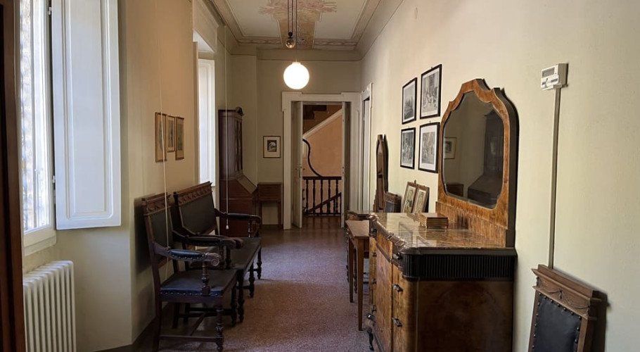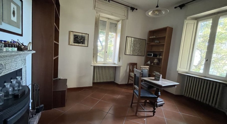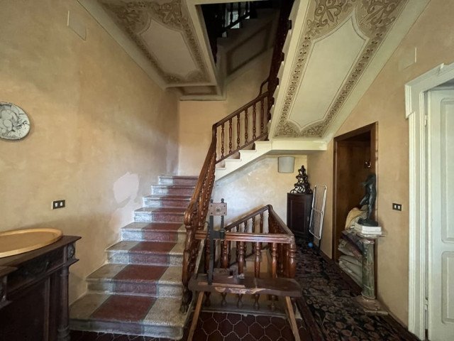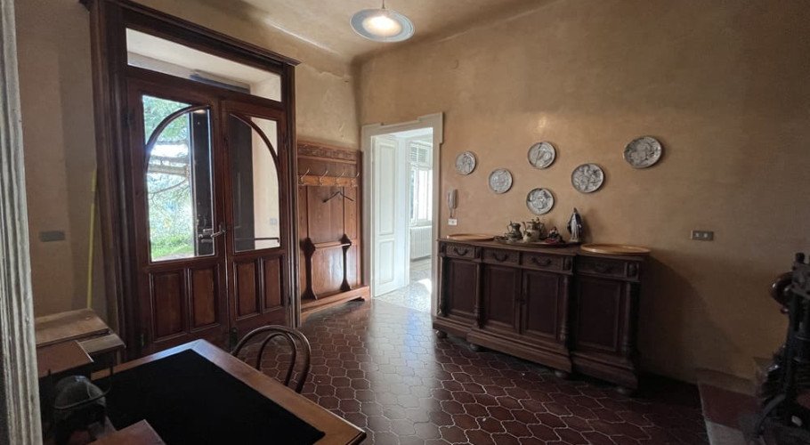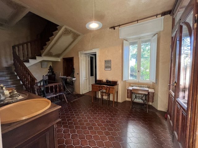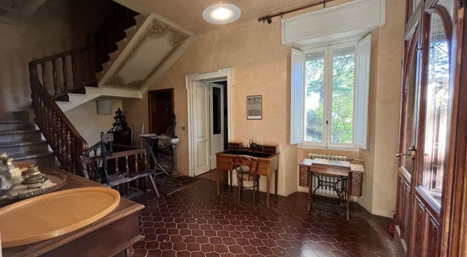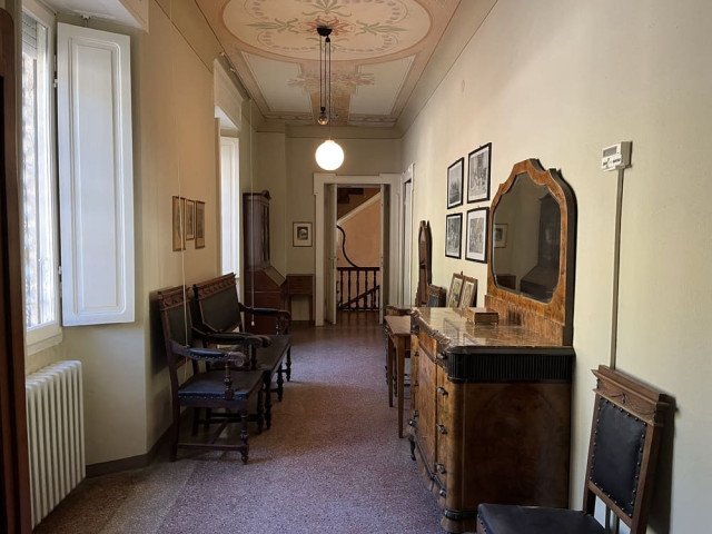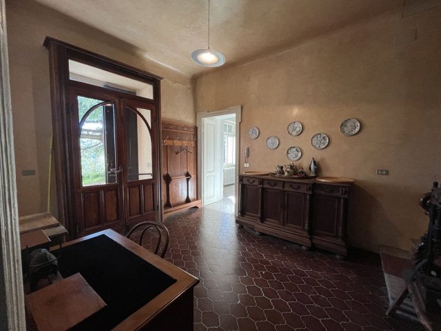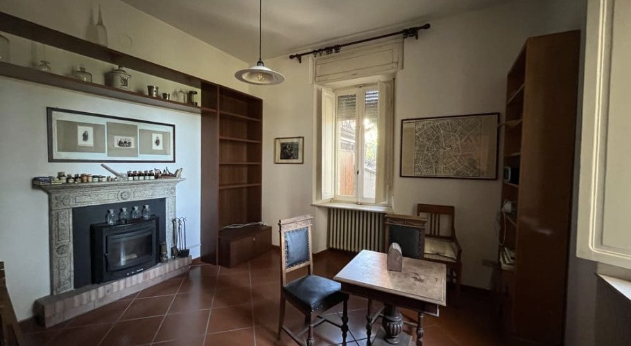 Continuing on the ground floor, you reach an office, located in a secluded spot away from distractions, served by an antique stone fireplace; The living room, also featuring a Verona red marble fireplace, and the dining room merge into a single space with the kitchen, complete with high-end appliances and two direct accesses to the garden.