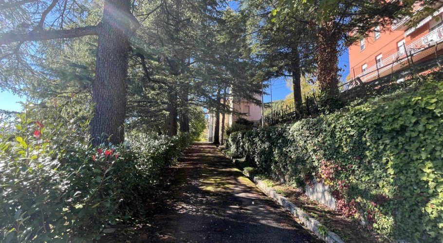 Villa Belvedere's fenced garden surrounds the entire property, spanning approximately 1,400 square meters. A beautiful tree-lined driveway leads to the property.