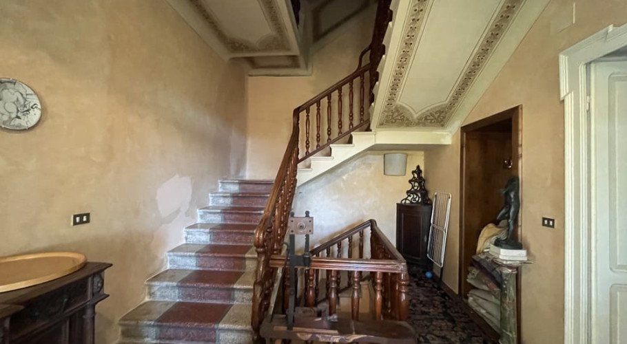 The entrance is from the elegant patio at the front of the house, which leads to the frescoed stairwell, illuminated by large windows.